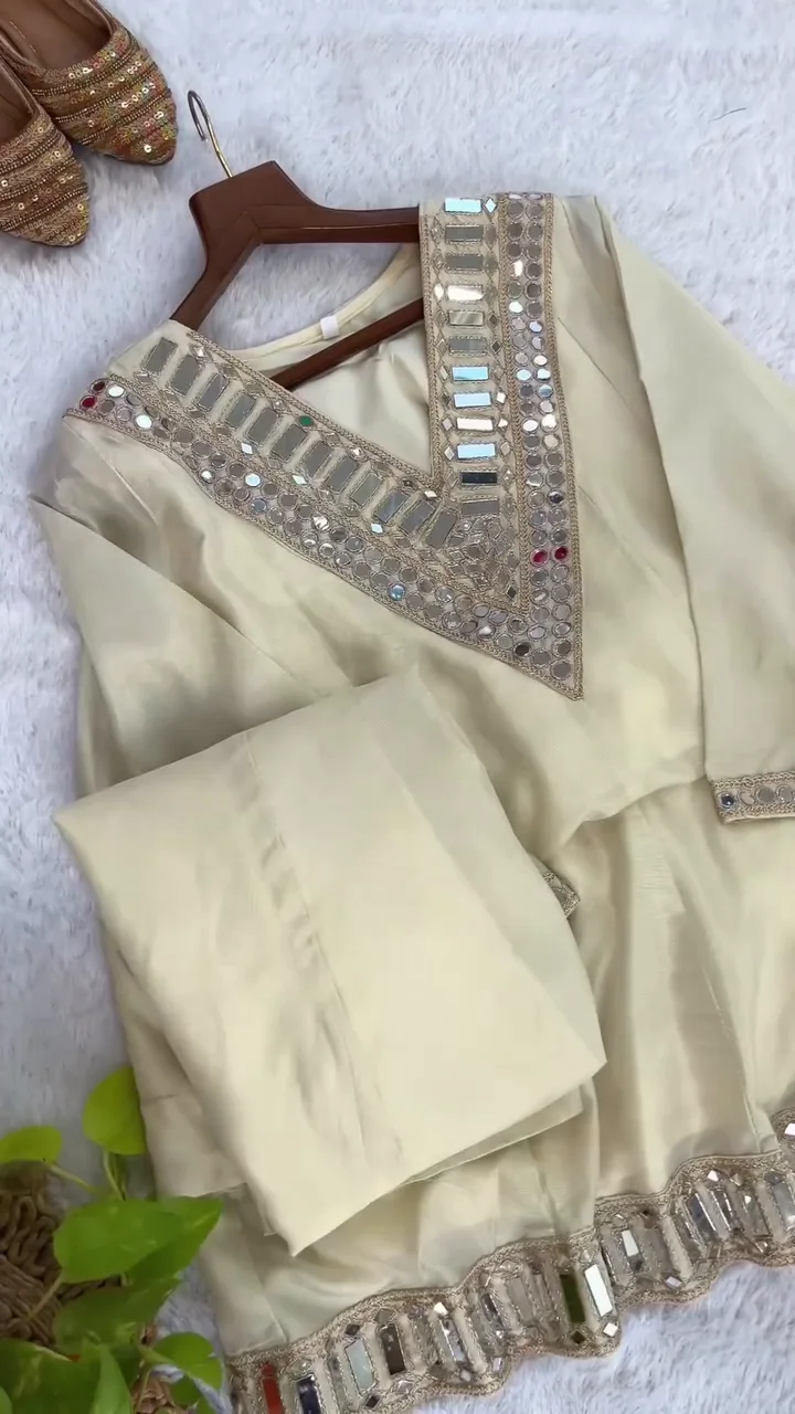 Step into refined elegance with this Ivory Mirror Work Kurta Set, thoughtfully designed for women who appreciate subtle luxury and timeless ethnic style. This beautifully crafted outfit blends traditional detailing with modern sophistication, making it a perfect choice for festive celebrations, wedding functions, and special occasions.